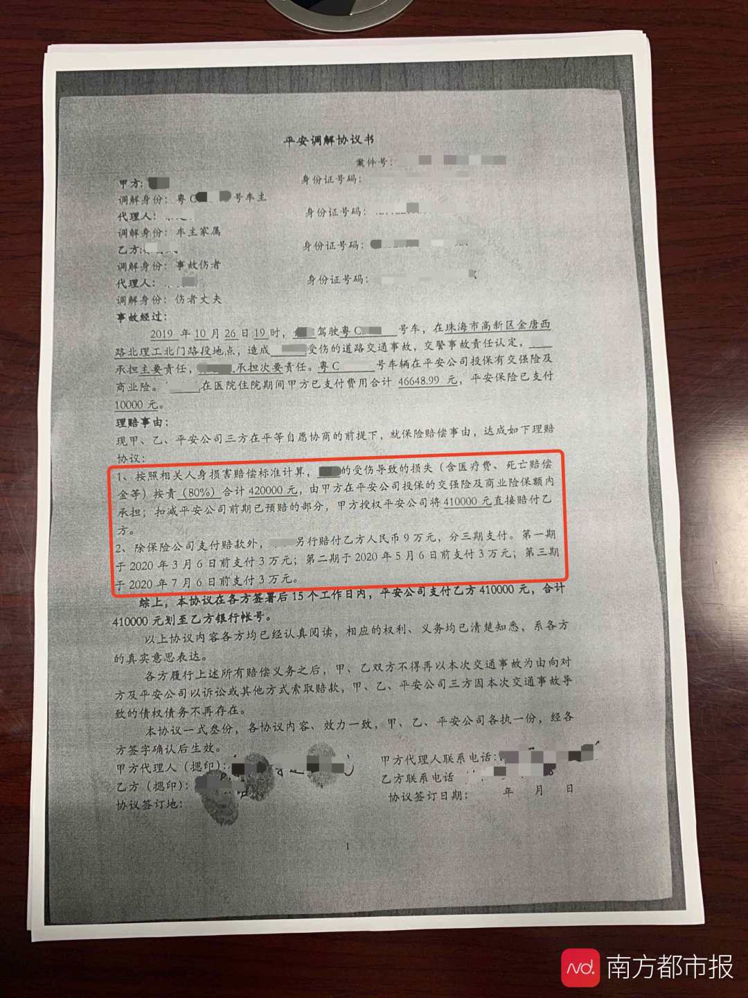 记者致电中国平安财产保险股份有限公司,相关工作人员透露,这起案件已经完成赔付。记者在一份“平安调解协议书”中看到,刘先生一方需要承担80%的主要责任;其中写明了保险公司须赔付42万元,刘先生另行赔付9万元,并分三期支付,最后一笔于2020年7月6日前完成支付。