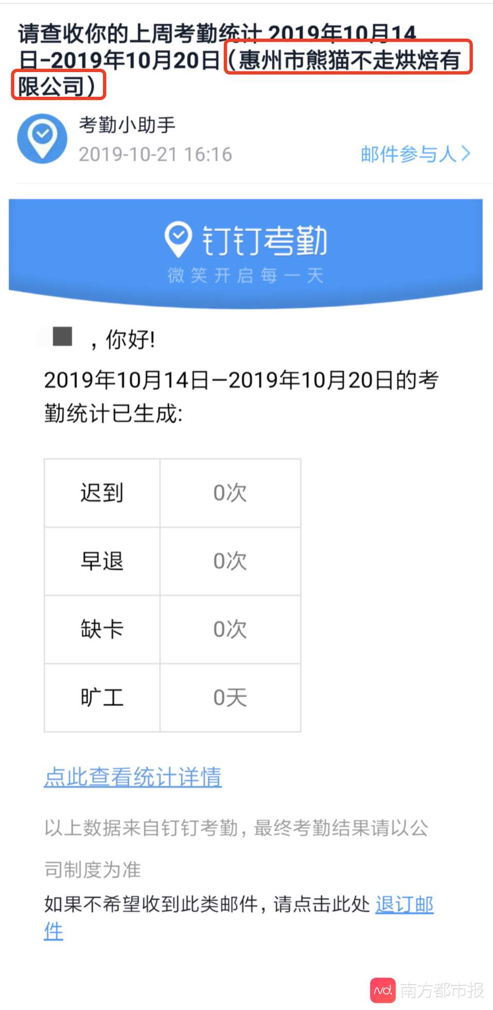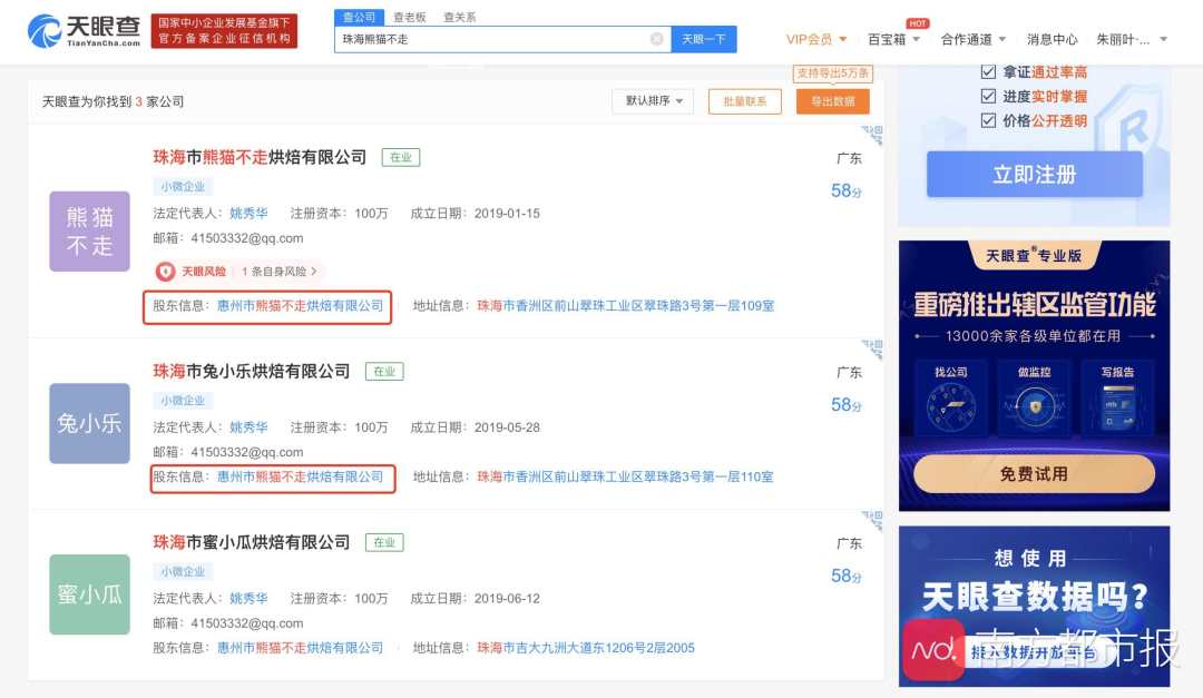 值得注意的是,刘先生告诉记者,自己入职的公司是珠海市熊猫不走烘焙有限公司,但是转给自己工资的账户主体是珠海市兔小乐烘焙有限公司,而“钉钉”考勤的公司主体是惠州市熊猫不走烘焙有限公司。记者从“天眼查”查询获悉,珠海市兔小乐烘焙有限公司与珠海市熊猫不走烘焙有限公司的股东均系惠州市熊猫不走烘焙有限公司,上述三家公司的法定代表人均系同一人。