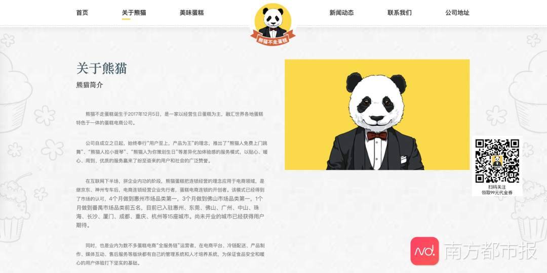 南都记者通过“熊猫不走蛋糕”官网了解到,该公司成立于2017年12月5日,现已入驻广州、珠海、惠州等15座城市,并且于2020年3月获得知名投资机构IDG数千万投资。