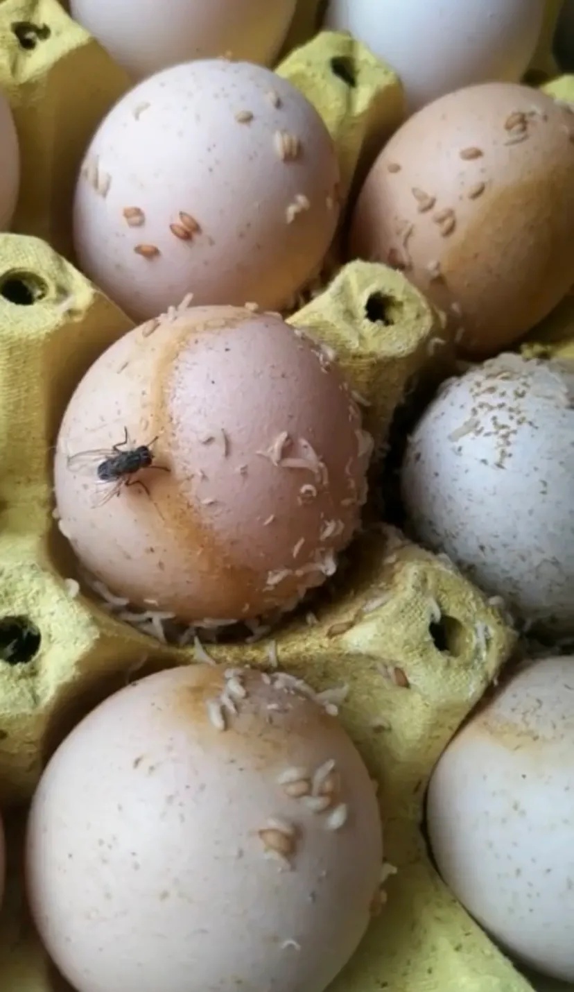 从周建刚提供的视频中可以看到,用纸浆蛋托盛装的鸡蛋里,有几个破裂的鸡蛋上爬满了白色的蛆,周围的鸡蛋都被覆满了褐色的蛆蛹,苍蝇在鸡蛋上飞来飞去。