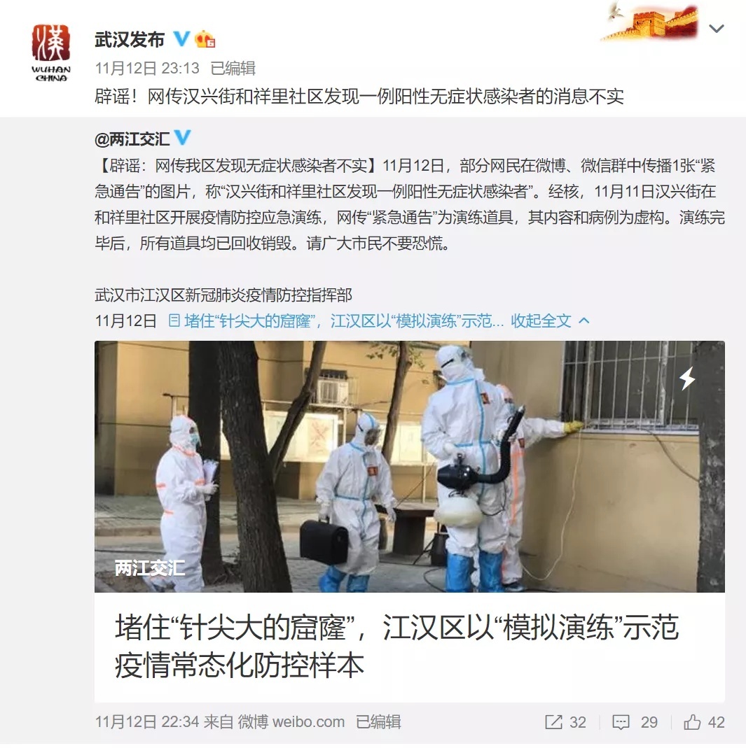 武汉市江汉区新冠肺炎疫情防控指挥部表示,经核,11月11日汉兴街在和祥里社区开展疫情防控应急演练,网传“紧急通告”为演练道具,其内容和病例为虚构。演练完毕后,所有道具均已回收销毁。请广大市民不要恐慌。