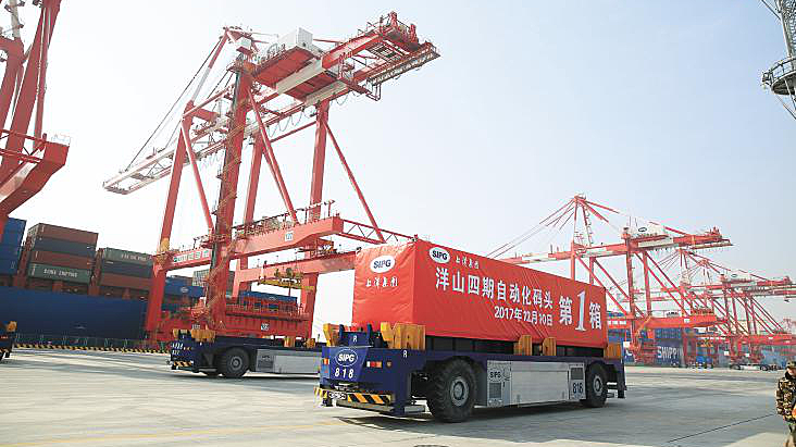 ?2017年12月,上海洋山港四期自动化码头装卸现场。