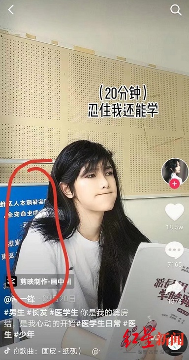 据相关视频截图显示,今年9月20日,泽一锋发布“#医学生 你是我的窦房结,是我心动的开始”视频,背景中曾出现一块被遮挡半边的蓝底白字提示牌,内容提到“发热”一词;在另一条相关视频中,泽一锋出现在一洗手池旁自拍,背景墙上贴着一幅七步洗手法的示意图。“这些都是疫情发生后,学校专门贴在教室和洗手间的提示牌,以前是没有的。”上述学生介绍道。