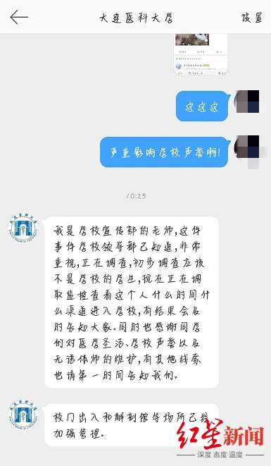 “学校已经注意到此事。”25日,大连医科大学一位工作人员告诉红星新闻记者,校方已加强对外来人员进出校园的管理,同时学校有关部门正在进行调查。此外,根据大连医科大学一名学生提供的对话截图显示,该校官方微博曾回复称,学校正在调取监控查看对方(泽一锋)是什么时候、通过什么渠道进入的学校。