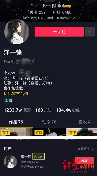 25日上午,红星新闻记者在某短视频平台上搜索“泽一锋”及其相关视频,发现该账号并未认证,目前约有104.4万粉丝,累计获得1233.7万次赞,但已发表的作品仅有76个。其中,引起网友争议的视频和涉及“医学生”话题的视频均已被删除。下午,红星新闻记者再次搜索该账号时,发现该账号已被设置为私密账号,无法查看账号内的任何内容。