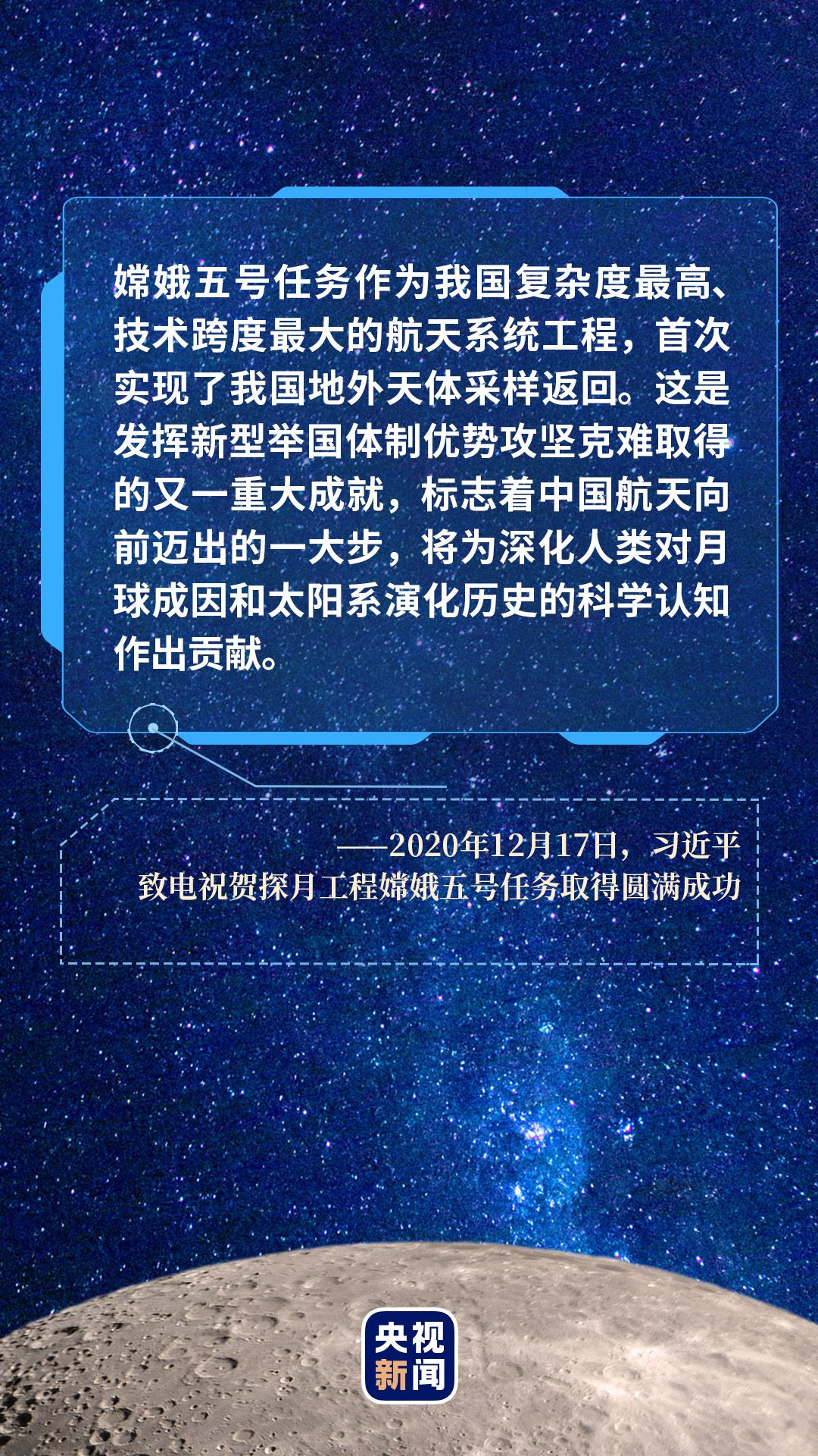 习近平总书记发来贺电,向探月工程任务指挥部并参加嫦娥五号任务的全体同志致以热烈的祝贺和诚挚的问候。