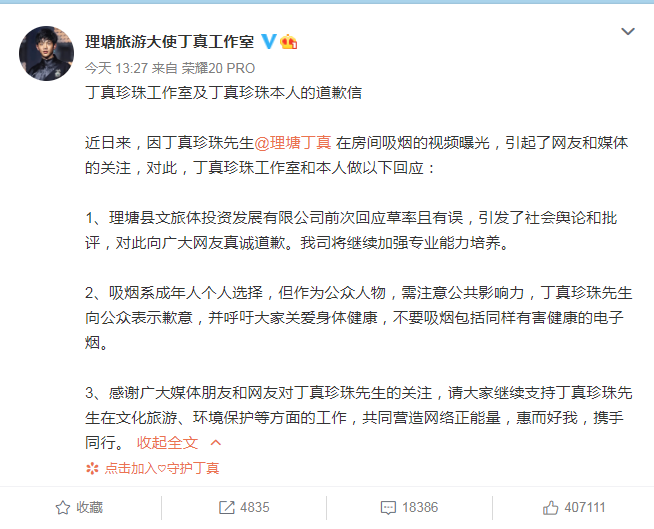 1月13日,丁真工作室就丁真被曝室内吸烟发声明道歉,称作为公众人物需注意公共影响力,对此向广大网友真诚道歉。