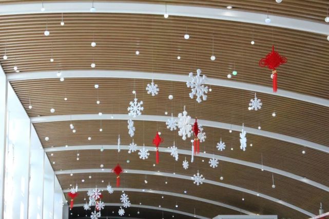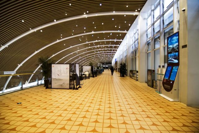 换乘中心采用了清水混凝土柱山水雕刻、马赛克艺术墙、仿木龙骨吊顶等艺术处理,让国内外运动员和旅客在候车休息时可以欣赏中国传统文化之美。