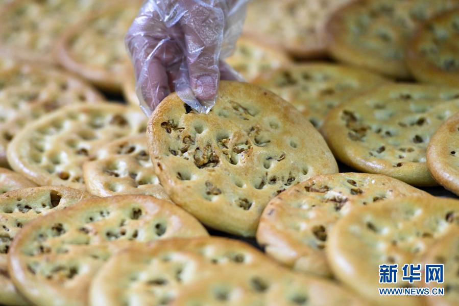 2月5日,在霍尔果斯馕产业园,工作人员分拣刚做好的核桃仁馕。新华社记者 丁磊 摄