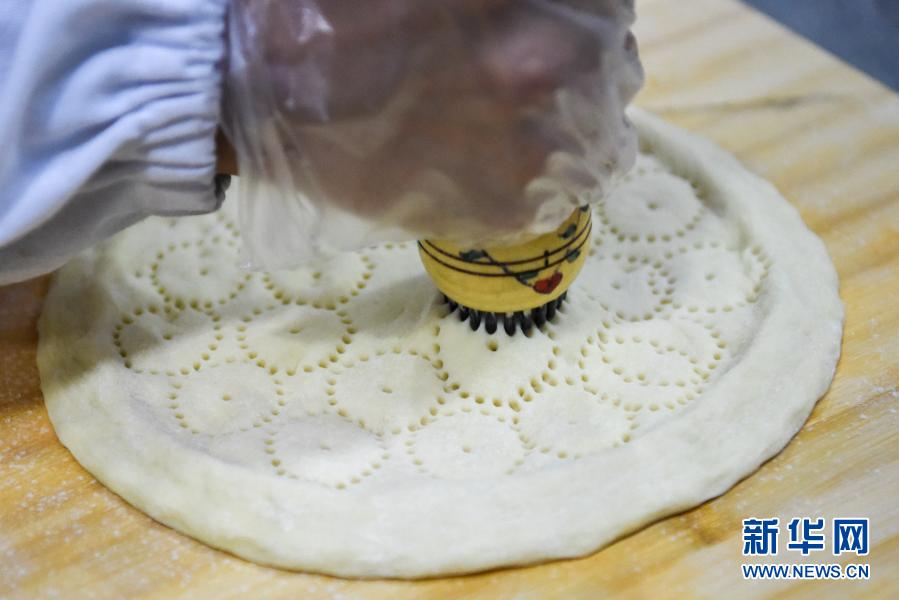 2月5日,在霍尔果斯馕产业园,工作人员用特制工具在馕坯上扎花纹。新华社记者 丁磊 摄