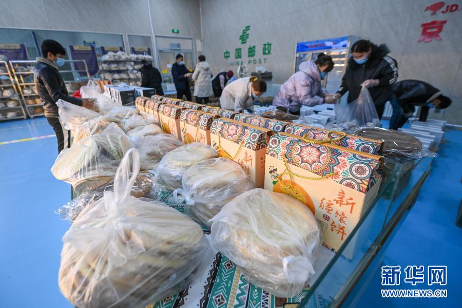 2月5日,在霍尔果斯馕产业园,工作人员将馕产品装箱。新华社记者 丁磊 摄