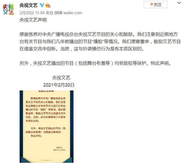 《国家宝藏》出品方央视文艺也声明称,“鼓励文艺节目在借鉴交流中创新”,并认为这与模仿抄袭有本质区别。