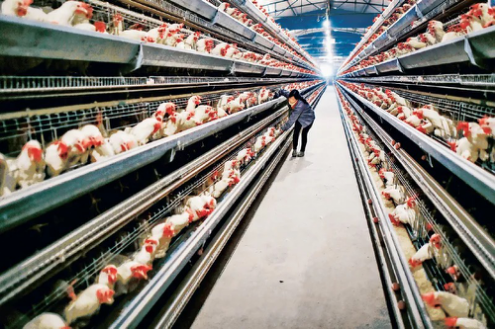 △通过因地制宜发展特色产业,贵州毕节市七星关区五里坪村农民逐渐脱贫走上了小康路。图为当地农户在一个属于精准扶贫项目的养鸡场内工作。
