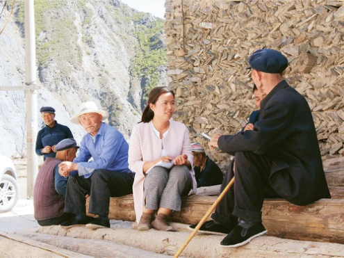 △2018年4月,甘肃省舟曲县扶贫办副主任张小娟(右二)在下乡时向群众了解情况。2019年10月7日,在扶贫下乡返程途中,张小娟因乘坐的车辆坠河不幸殉职。