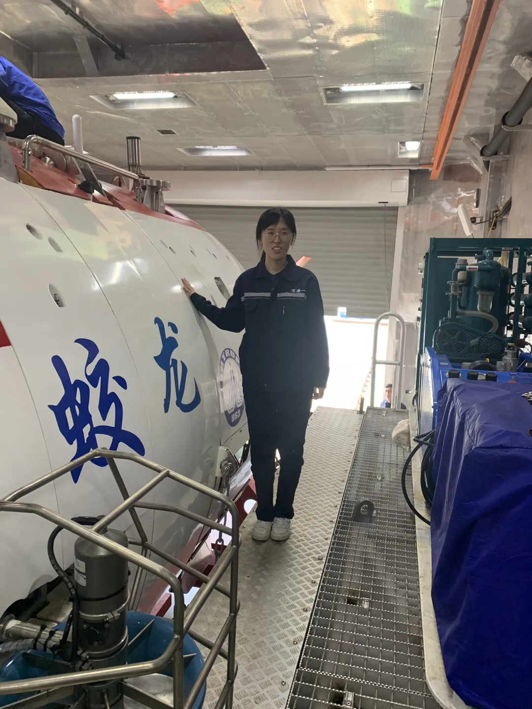 “派大星”背板海星的命名者、自然资源部第二海洋研究所博士研究生张睿妍与“蛟龙号”载人深潜器。受访者供图