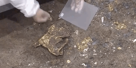 这半张面具宽约23厘米,高约28厘米,含金量为85%左右,银含量在13%到14%左右。根据半张面具推测,这件黄金面具的完整重量应该超过500克。