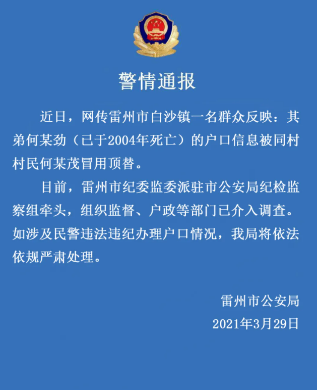 近日,网传雷州市白沙镇一名群众反映:其弟何某劲(已于2004年死亡)的户口信息被同村村民何某茂冒用顶替。