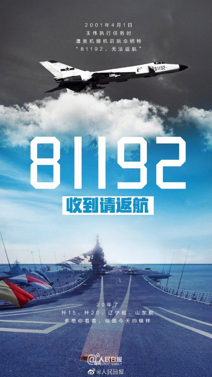 2001年4月1日,王伟为保卫祖国领空,遭美机撞机被迫跳伞坠海,壮烈牺牲。81192,无法返航。王伟牺牲20年了,20年,我们从未忘却,你的精神,永远刻在祖国的海天!
