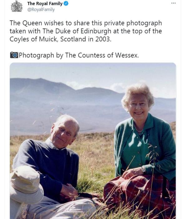 英国王室在社交网站上表示,女王希望与众人分享这张2003年与爱丁堡公爵在苏格兰Coyles of Muick拍的私人照片。这张照片首次公诸于世。