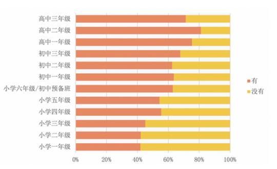 高中生拥有个人专属电子移动设备的学生比例为77.4%,这一比例在初中生中是64.6%,而小学阶段为50.7%。此外,年级之间也存在差异。课题组调查数据显示,年级越高(除高三外),拥有移动电子产品的学生比例越高。即使是小学一年级学生,也有超过40%学生拥有自己的移动电子产品。