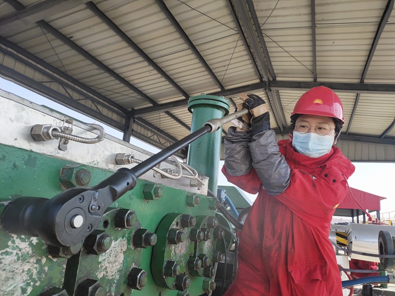 冯萌萌正在检修注水泵液力端(央广网发 受访者供图)
