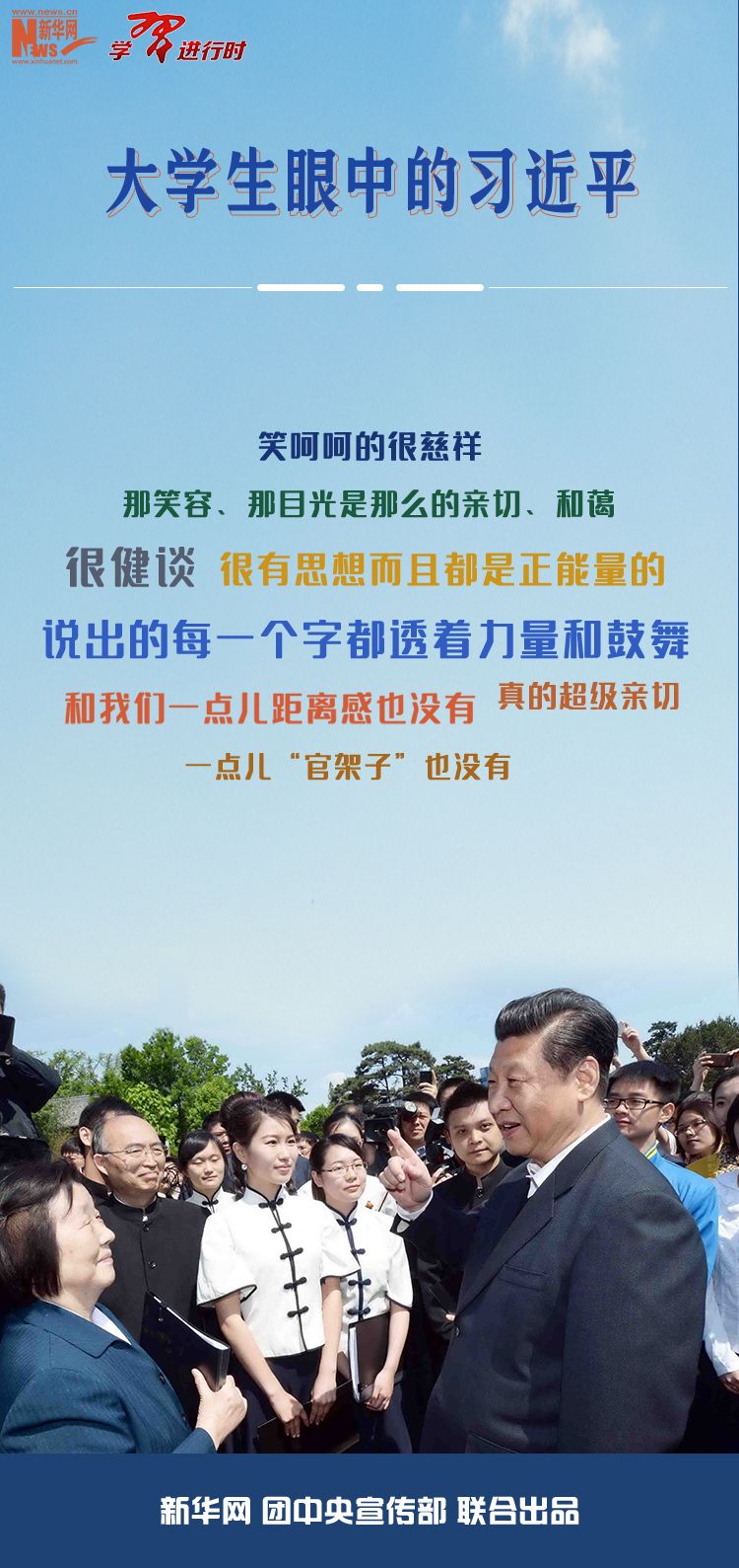 【学习进行时】习近平对青年特别是大学生的重视关怀始终如一,多次与青年大学生交流交心交友。凡是与习近平有接触的大学生,谈起和他交往的一点一滴都记忆犹新,都认为习近平的一言一行一直深深影响着他们、激励着他们。新华社《学习进行时》为您整理了不同时期多位大学生对习近平的深刻印象,与您共同感受这份亲切与温暖。