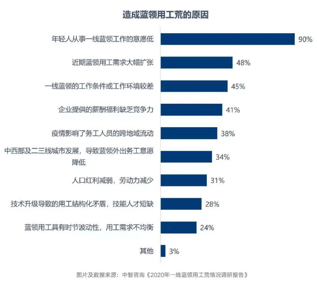《2020年一线蓝领用工荒情况调研报告》显示,年轻人从事一线蓝领工作的意愿低是造成蓝领用工荒的主要原因。