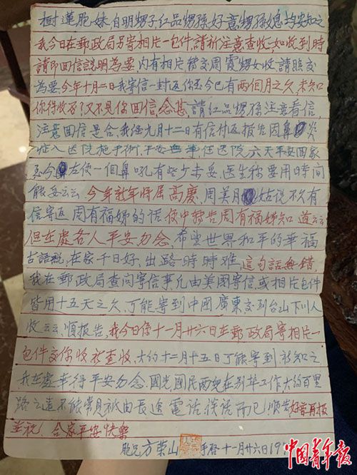 上世纪70年代,朱红品曾替家人跟大舅公通过信,方荣山的信中经常有一句“世界大战难免,希望世界和平。”那时方荣山已经很老了,总是在信里说着鼻子不舒服、眼睛生病了。