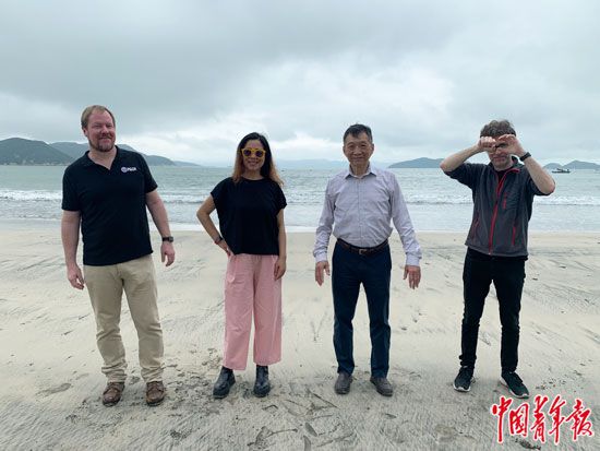 制作团队在下川岛留影,脚下是当年方荣山离家的地方。从左至右依次为首席研究员施万克、制片人罗彤、研究员李大川、导演罗飞。中青报·中青网记者 杨杰/摄
