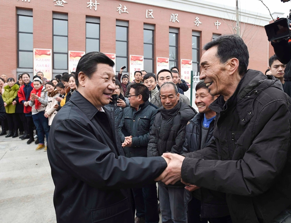 △2015年2月14日下午,习近平来到陕西省铜川市照金镇,向陕甘边革命根据地英雄纪念碑敬献花篮并参观纪念馆。随后,前往照金村村委会,考察当地发展情况,同村民交流,向乡亲们致以新春祝福。