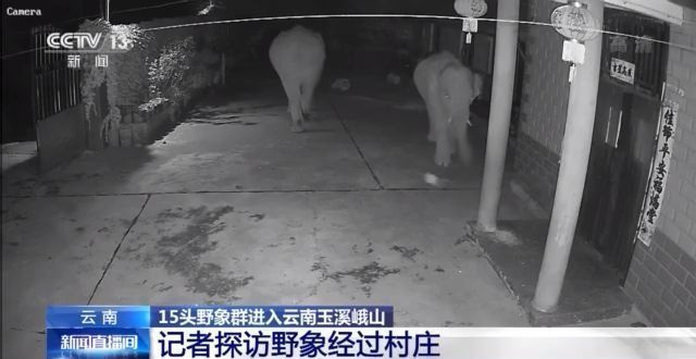 一户村民家车棚的摄像头记录了两头大象进院全过程。28日晚9点半左右,两头大象进入村民家院子,用鼻子翻找吃的,并将该村民家的一扇门撞变形。这两头大象还将村民家的酒缸塞子和鸟笼子弄坏,鸟笼中的巴哥也飞走了。