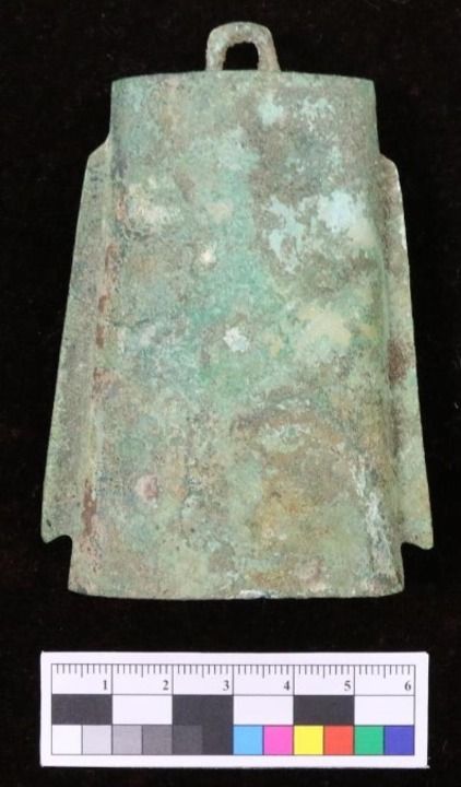 三星堆二号“祭祀坑”出土的青铜铃,其上也检测到纺织物痕迹。(中国丝绸博物馆提供)