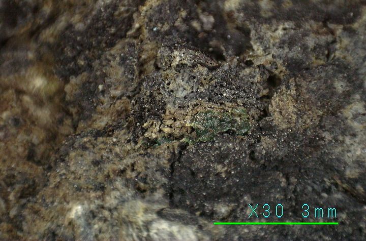 在三星堆青铜器表面发现的矿化纺织物痕迹。(中国丝绸博物馆提供)