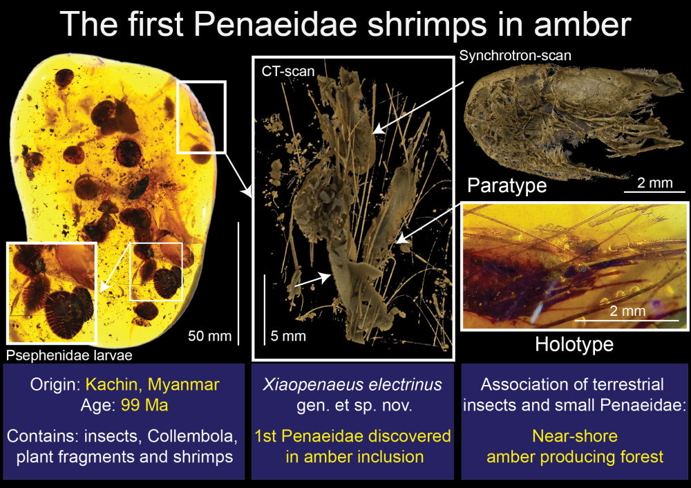 科学家发现一枚距今9900万年的琥珀化石中竟完整保存了四只对虾。该成果于北京时间5日发表在了国际期刊《科学通报》上。