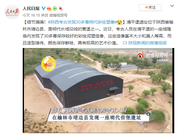 清平堡遗址位于陕西省榆林市靖边县,是明代长城沿线的营堡之一。近日,考古人员在清平堡的一座城隍庙内发现了30多尊保存较好的彩绘泥塑造像,这些造像基本大小和真人等高,而且造型雄伟,颜色保存鲜艳,具有极高的艺术价值。