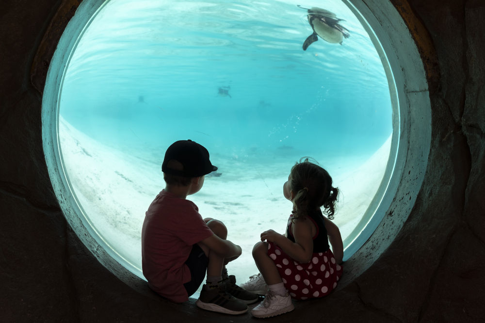 2020年6月15日,两名儿童在英国伦敦动物园通过水下窗口观看企鹅。(新华社记者韩岩摄)