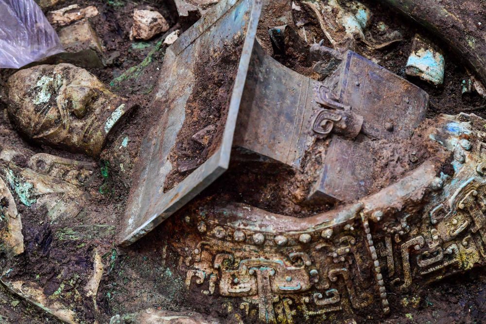 这是三星堆遗址新发现的3号“祭祀坑”内的青铜方尊和青铜面具。新华社记者 张超群 摄