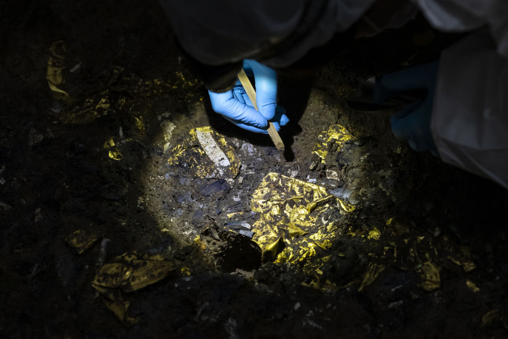 三星堆考古发掘现场5号“祭祀坑”中,考古人员清理新发现的金面具残片。新华社记者 沈伯韩 摄