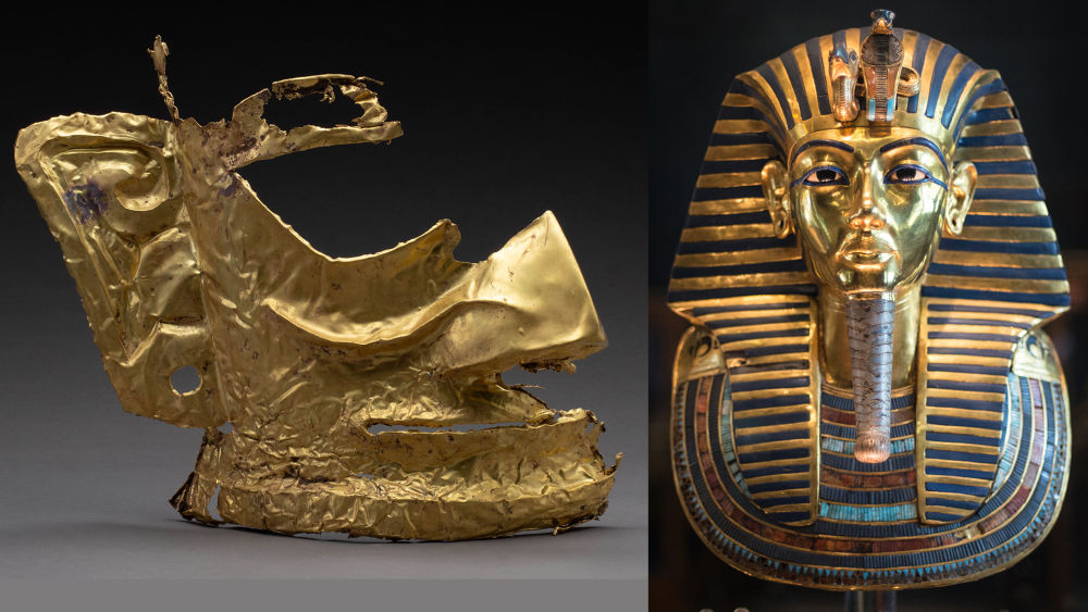 三星堆遗址考古发掘现场5号“祭祀坑”出土的残缺的金面具(左)和埃及博物馆内的图坦卡蒙黄金面具(右)。拼版照片,左图由考古中国项目——三星堆遗址祭祀区考古发掘项目提供,右图为新华社记者 潘超越 摄