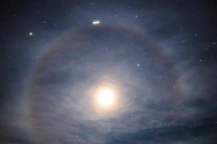 北京市天文爱好者王俊峰2019年12月22日在云南红河拍摄的ISS飞越月晕的照片。(本人供图)