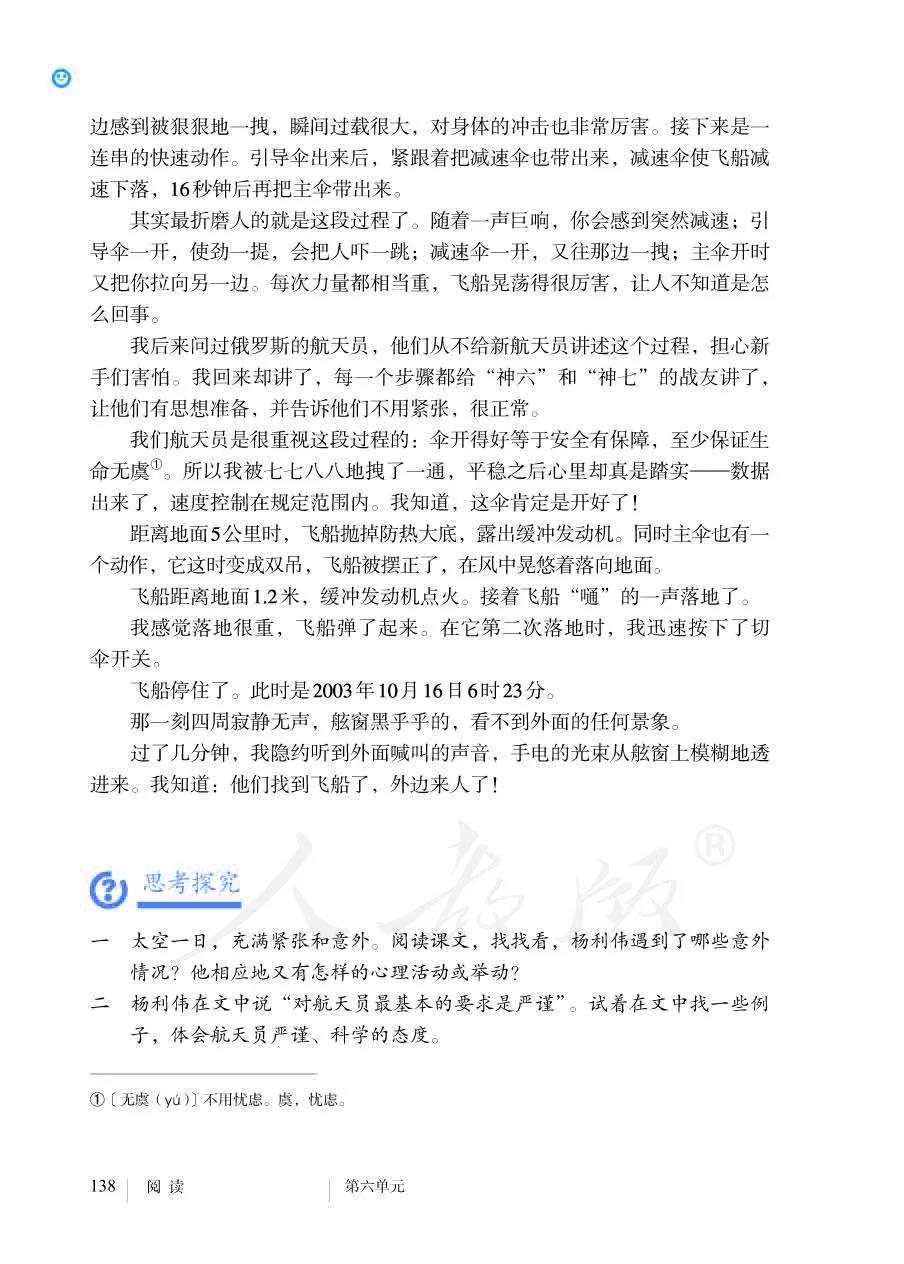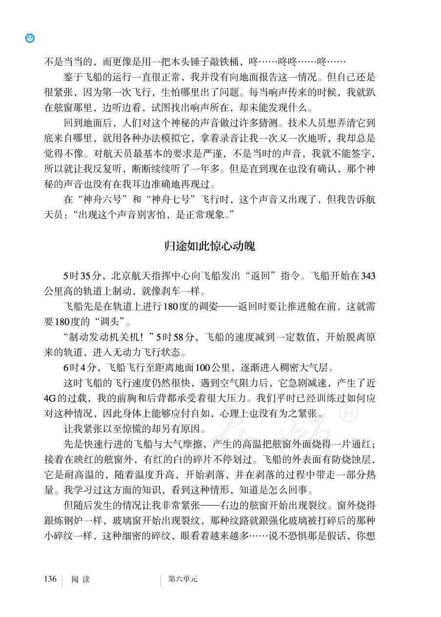 近日有网友发现,人教版七年级下册语文书中有篇课文名为《太空一日》,作者正是杨利伟。