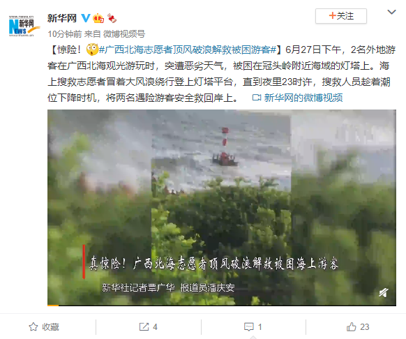 【惊险!广西北海志愿者顶风破浪解救被困游客】6月27日下午,2名外地游客在广西北海观光游玩时,突遭恶劣天气,被困在冠头岭附近海域的灯塔上。海上搜救志愿者冒着大风浪绕行登上灯塔平台,直到夜里23时许,搜救人员趁着潮位下降时机,将两名遇险游客安全救回岸上。