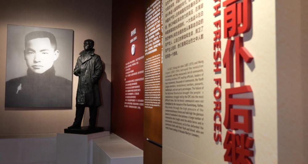 图为南京市雨花台烈士纪念馆陈列的邓中夏烈士的肖像和塑像。