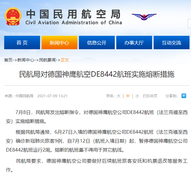 7月8日,民航局发出熔断指令,对德国神鹰航空公司DE8442航班(法兰克福至西安)实施熔断措施。