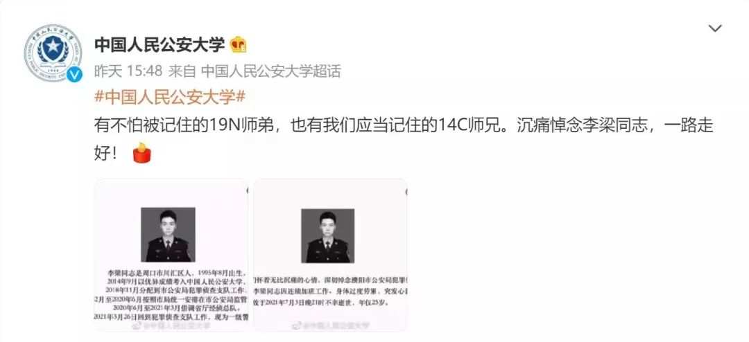 @中国人民公安大学 微博发文悼念。