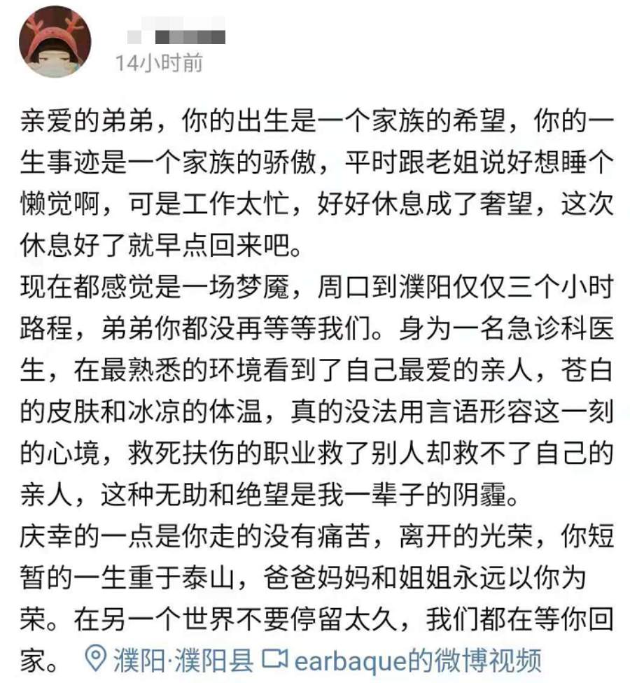 现在都感觉是一场梦魇,周口到濮阳仅仅三个小时路程,弟弟你都没再等等我们。身为一名急诊科医生,在最熟悉的环境看到了自己最爱的亲人,苍白的皮肤和冰凉的体温,真的没法用言语形容这一刻的心境,救死扶伤的职业救了别人却救不了自己的亲人,这种无助和绝望是我一辈子的阴霾。