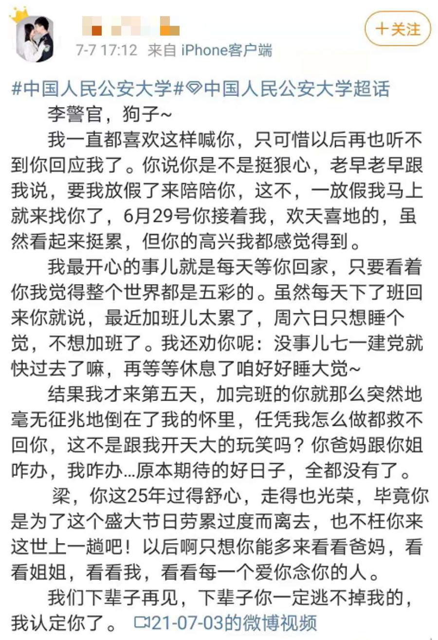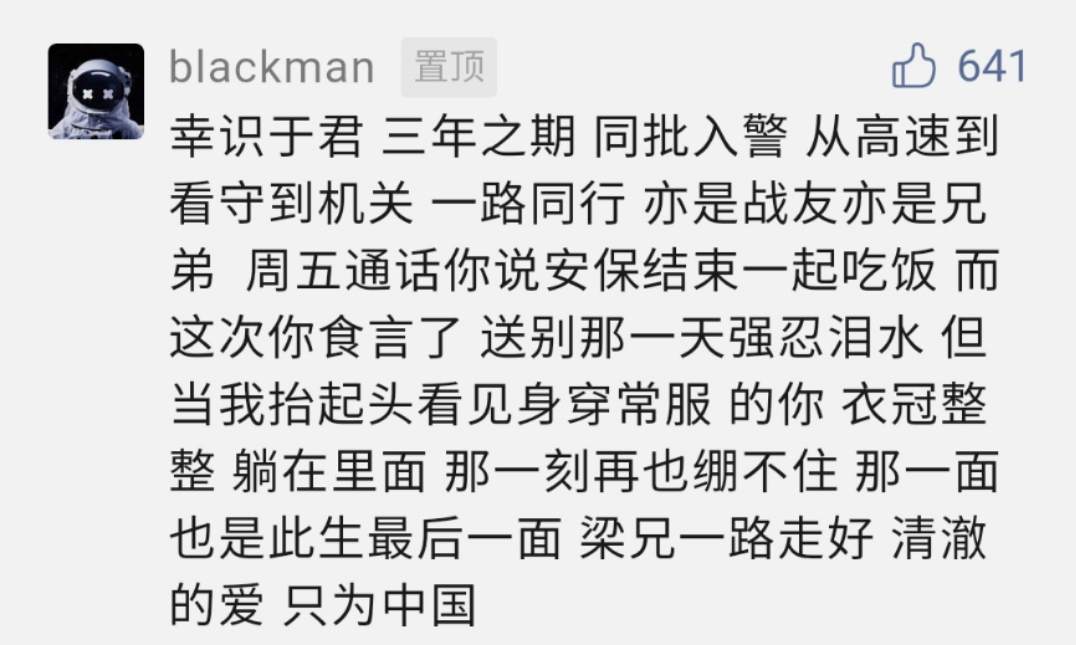 李梁的公安大学同学留言悼念。