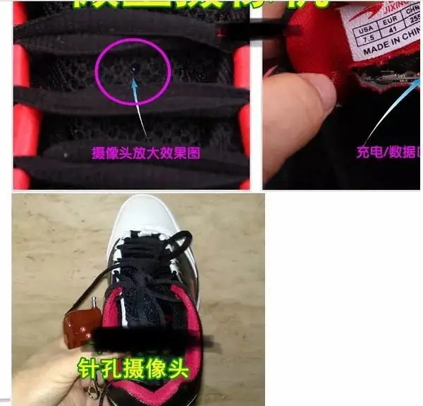 比如藏在鞋内侧的针孔摄像机↓