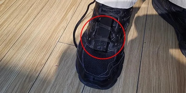 一男子把摄像头绑在鞋上