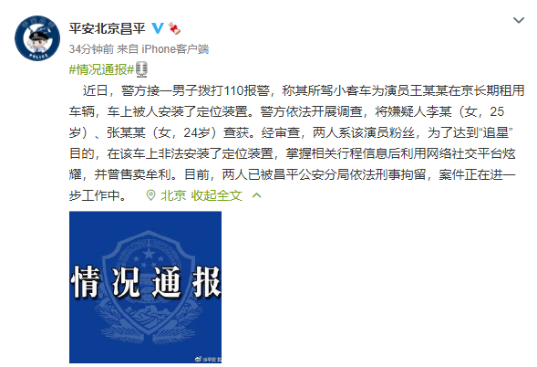 近日,警方接一男子拨打110报警,称其所驾小客车为演员王某某在京长期租用车辆,车上被人安装了定位装置。警方依法开展调查,将嫌疑人李某(女,25岁)、张某某(女,24岁)查获。经审查,两人系该演员粉丝,为了达到“追星”目的,在该车上非法安装了定位装置,掌握相关行程信息后利用网络社交平台炫耀,并曾售卖牟利。目前,两人已被昌平公安分局依法刑事拘留,案件正在进一步工作中。